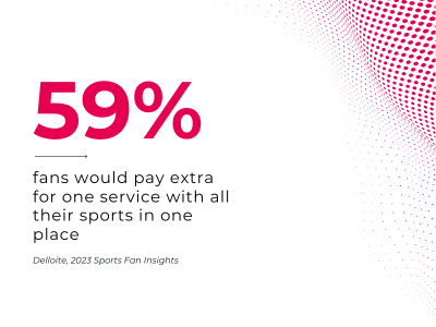 But with so many options, fans are also feeling the strain of juggling multiple subscriptions. Nearly half of them miss games they want to watch because they don’t have the right service, and 44% say they’re subscribed to too many. The solution? Streamlined access. More than half of all fans – and 80% of millennials – would happily pay for a single service that brings all their sports content together.