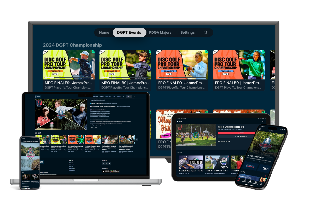 This is the DGN platform today – available across web, mobile, and smart TVs, Apple and Android TV – and we built it around the non-negotiables that the Disc Golf Pro Tour set out from day one.
